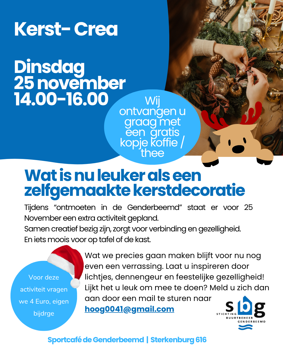 De mensen van Ontmoeten in de Genderbeemd (elke dinsdag van 14:00-16:00 in Sportcafé de Genderbeemd) hebben weer een aantal fijne activiteiten klaar staan: